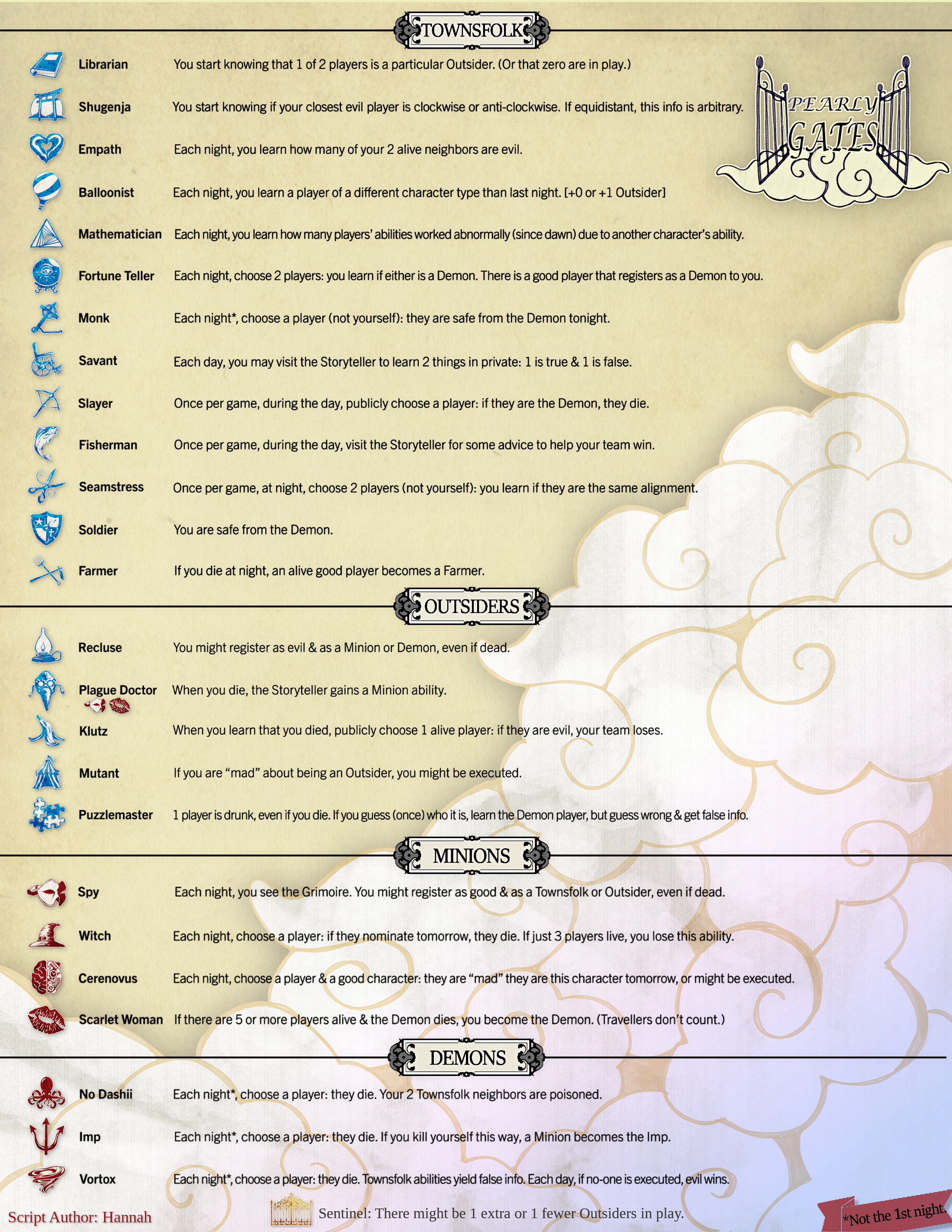 Un guión muy versatil, simple y confiable para partidas interesantes, con enfoque en puzzle de información, se centra en la presencial del Fabled Sentinel y como interactúa con los Forasteros en juego y fuera de juego, perfecto para partidas pequeñas y también grandes.