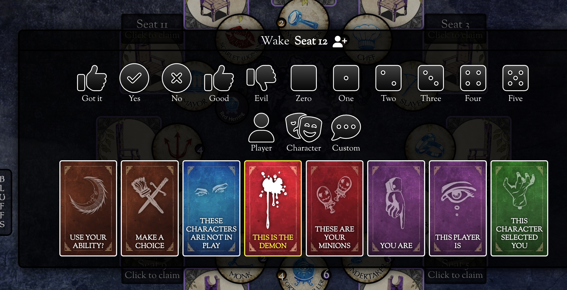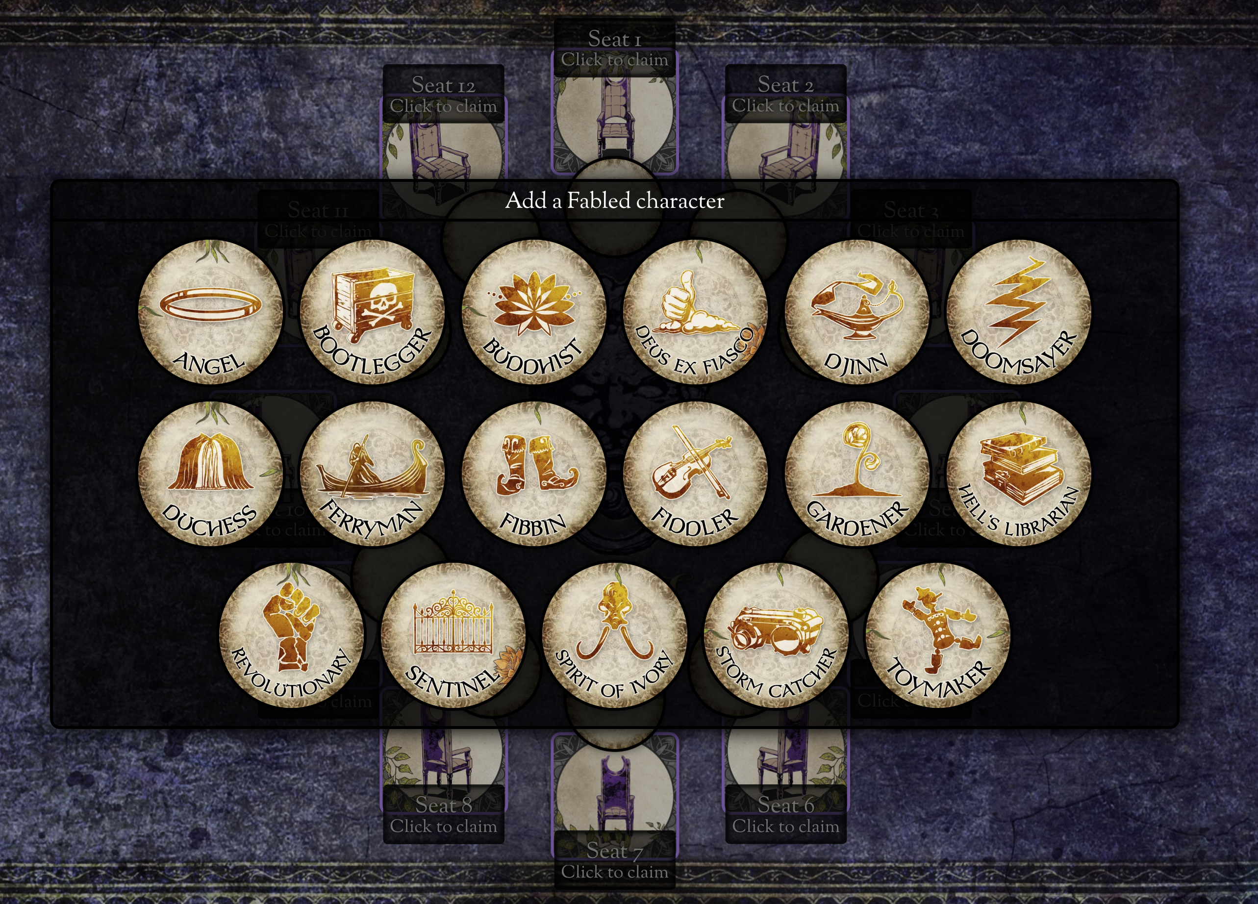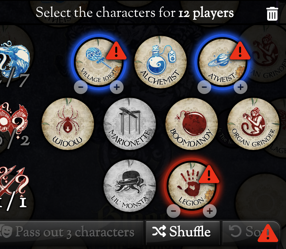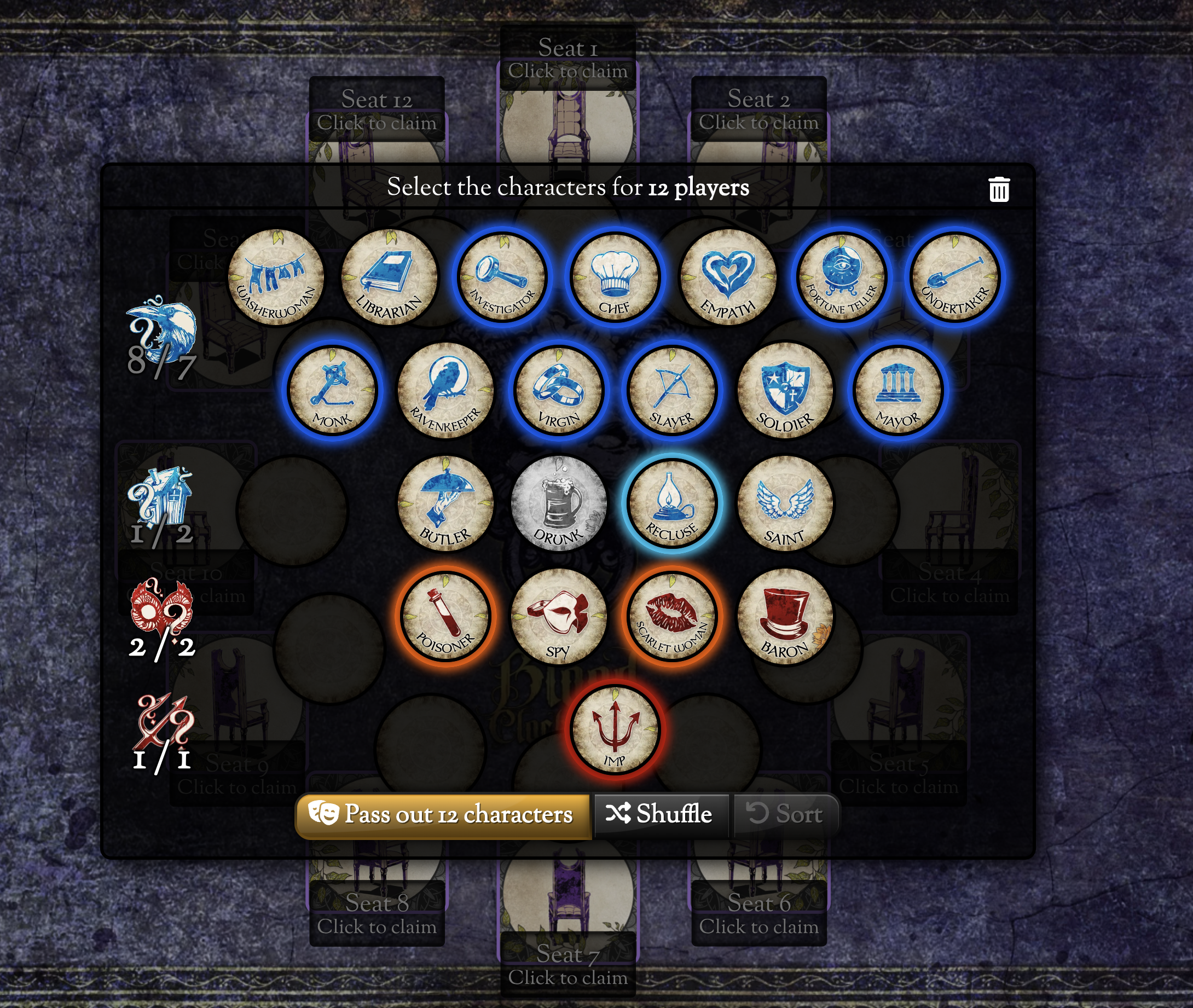 Con la tecla 5 puedes abrir el selector de personajes, lo que añadirías a la bolsa en una partida en físico. Funciona igual que eso, sin que añadas al Borracho sino un Aldeano más y ese tipo de circustancias. La propia pestaña te recuerda cuántos personajes hay por tipo según los jugadores (en realidad, los asientos abiertos). Cuando lo tengas, dale a Pass out X characters y los distribuirá aleatoriamente.