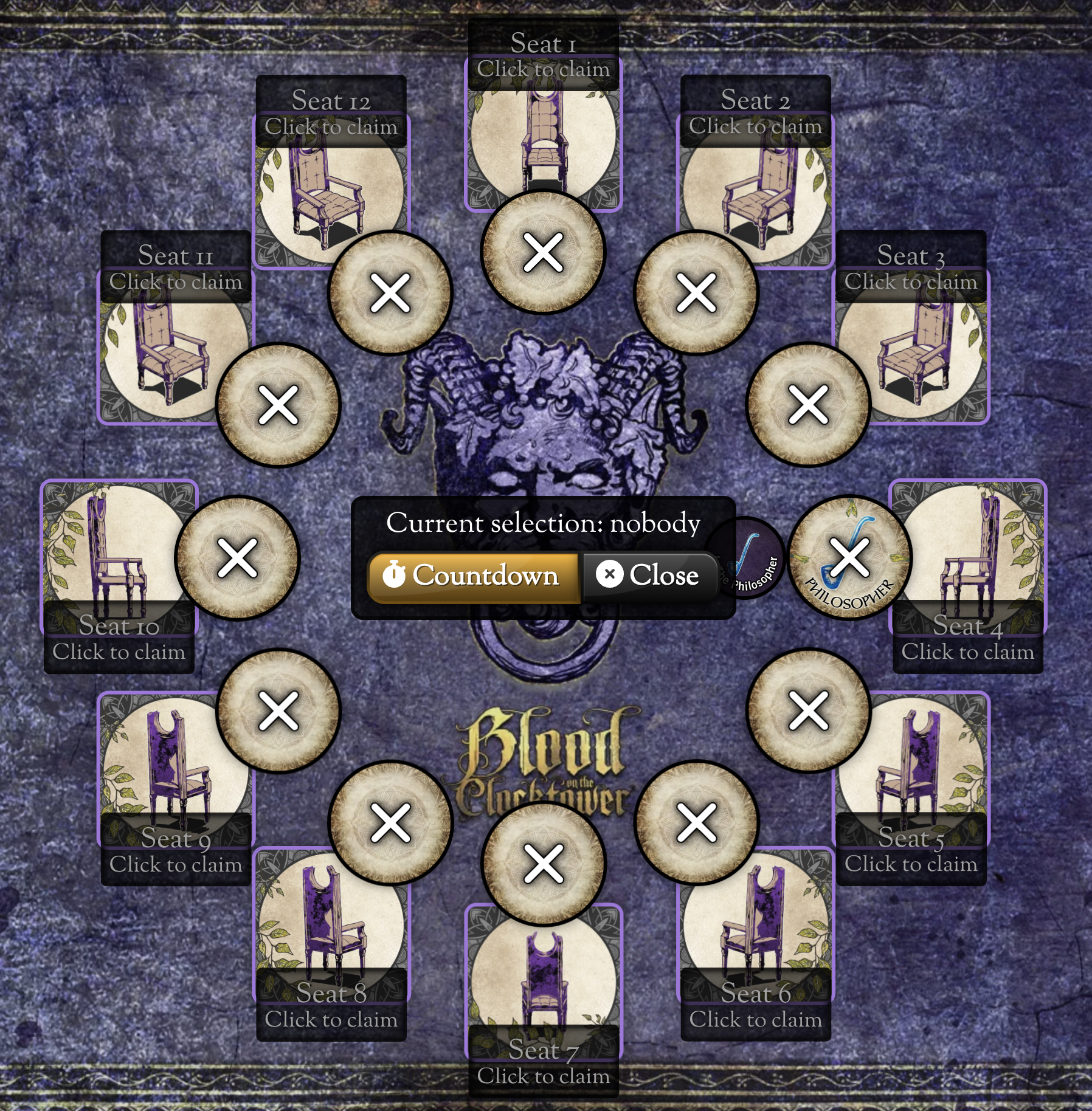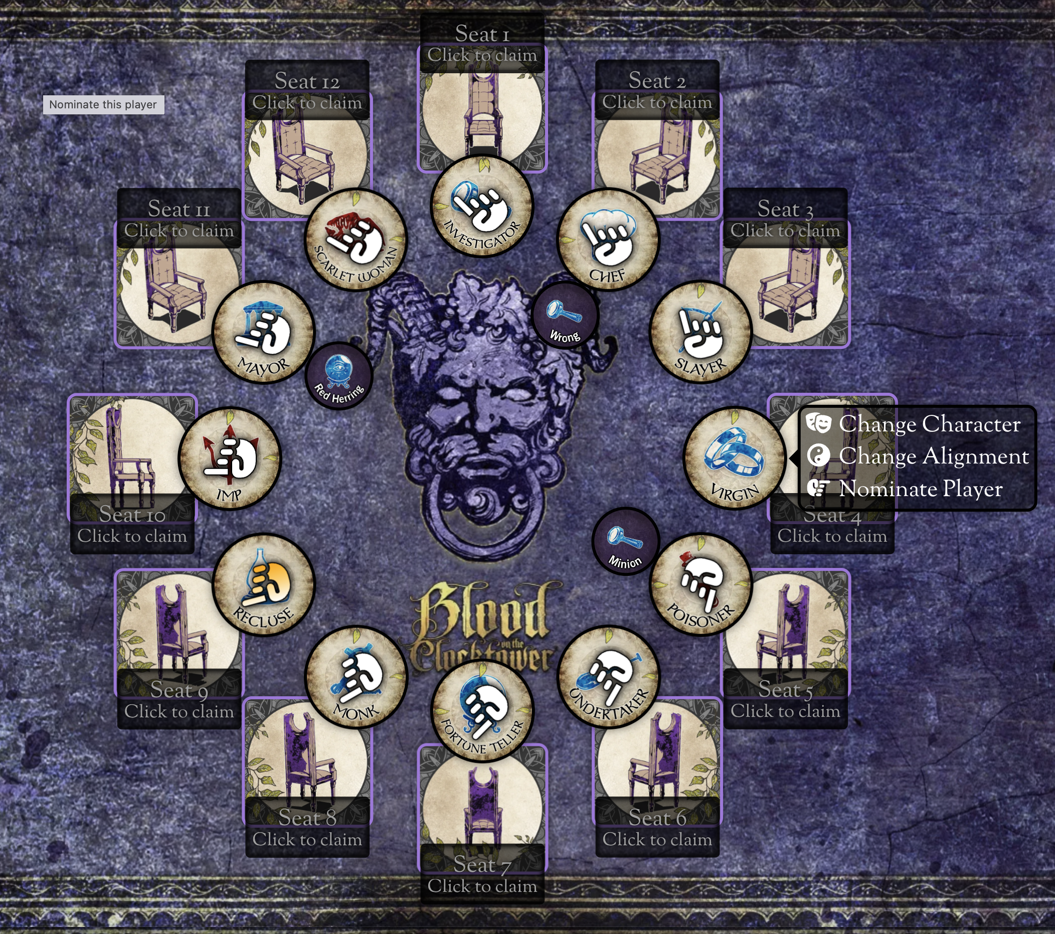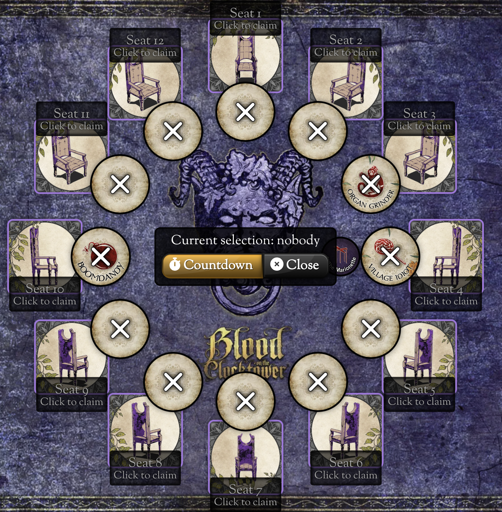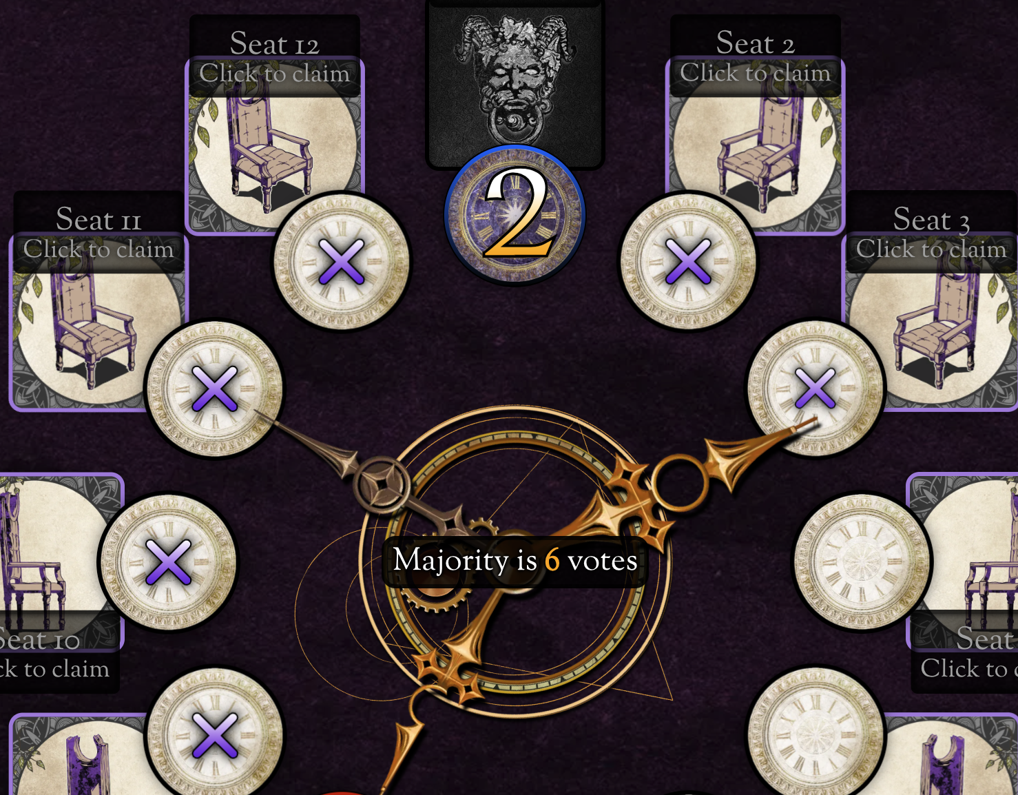 Cuando un jugador nomine a otro, haz clic en el personaje del jugador que nomina y, después, clic en el nominado. Te aparecerán las agujas y la opción de hacer una cuenta (Countdown)) atrás antes de que empiece a moverse la aguja.