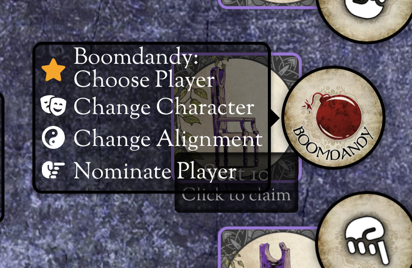 Para el bomdandy, cuando se aplica su habilidad, hay que hacer clic en su personaje y darle a Boomdandy: Choose Player. Ahí le abrirá a todos los jugadores un selecto de otros jugadores. El Countdown hará una cuenta atrás de 3 segundos y después fijará la elección con más votos.