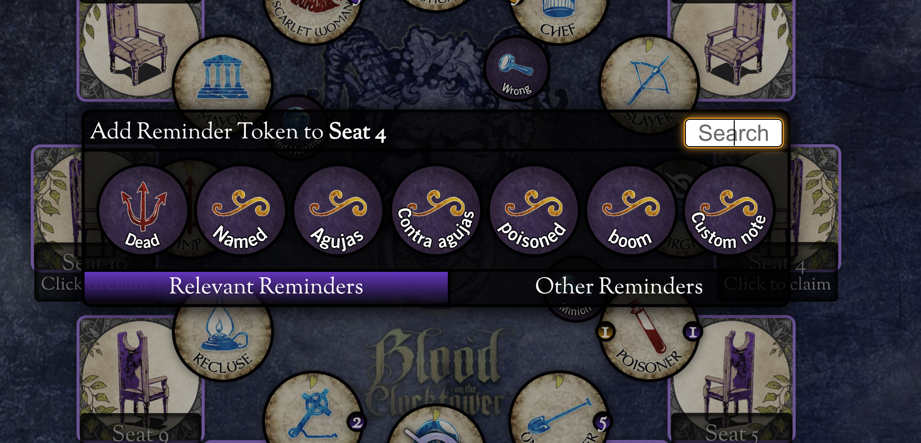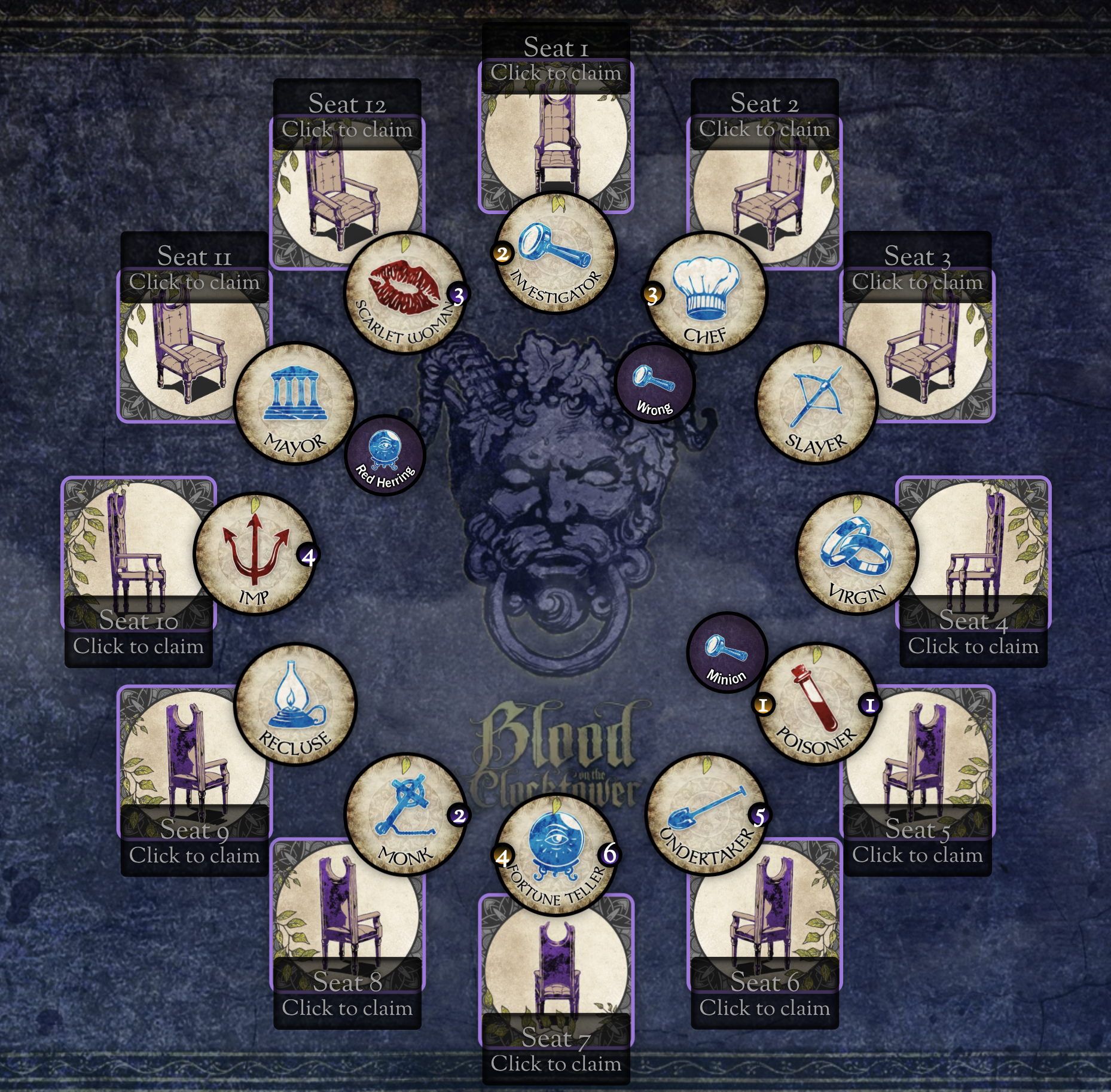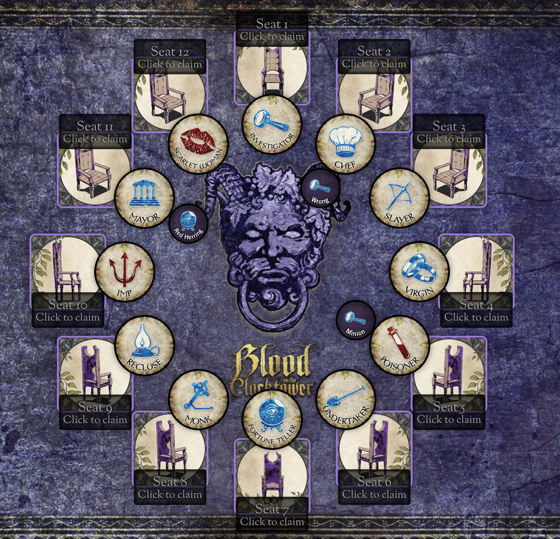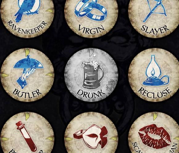 Los personajes que ganan otra habilidad o creen que la tienen, como Filósofo, Marioneta, Borracho o Alquimista, se marcan como el personaje que creen ser o cuya habilidad tienen y, como recordatorio, el personaje que son. Así, al revelar el Grimorio, aparecerá el personaje real, no el que creen ser.
