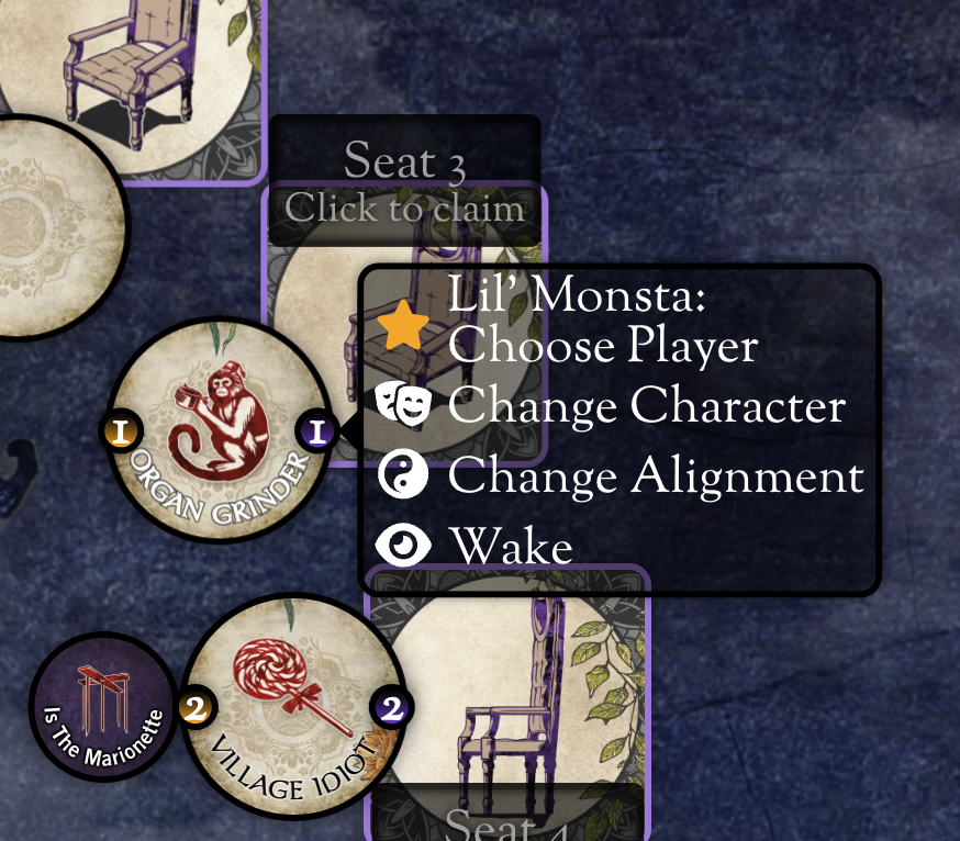 Cuando Lil' Monsta es el Demonio, la aplicación no te deja elegir a ese Demonio, simplemente añades un Esbirro más. Por la noche, cuando los Esbirros deben elegir quién cuida a Lil' Monsta, haz clic a la ficha de cualquier Esbirro (salvo uno) y te aparecerá la opción de Lil' Monsta: Choose Player. Los Esbirros podrán elegir como con el Boomdandy que hemos visto antes.