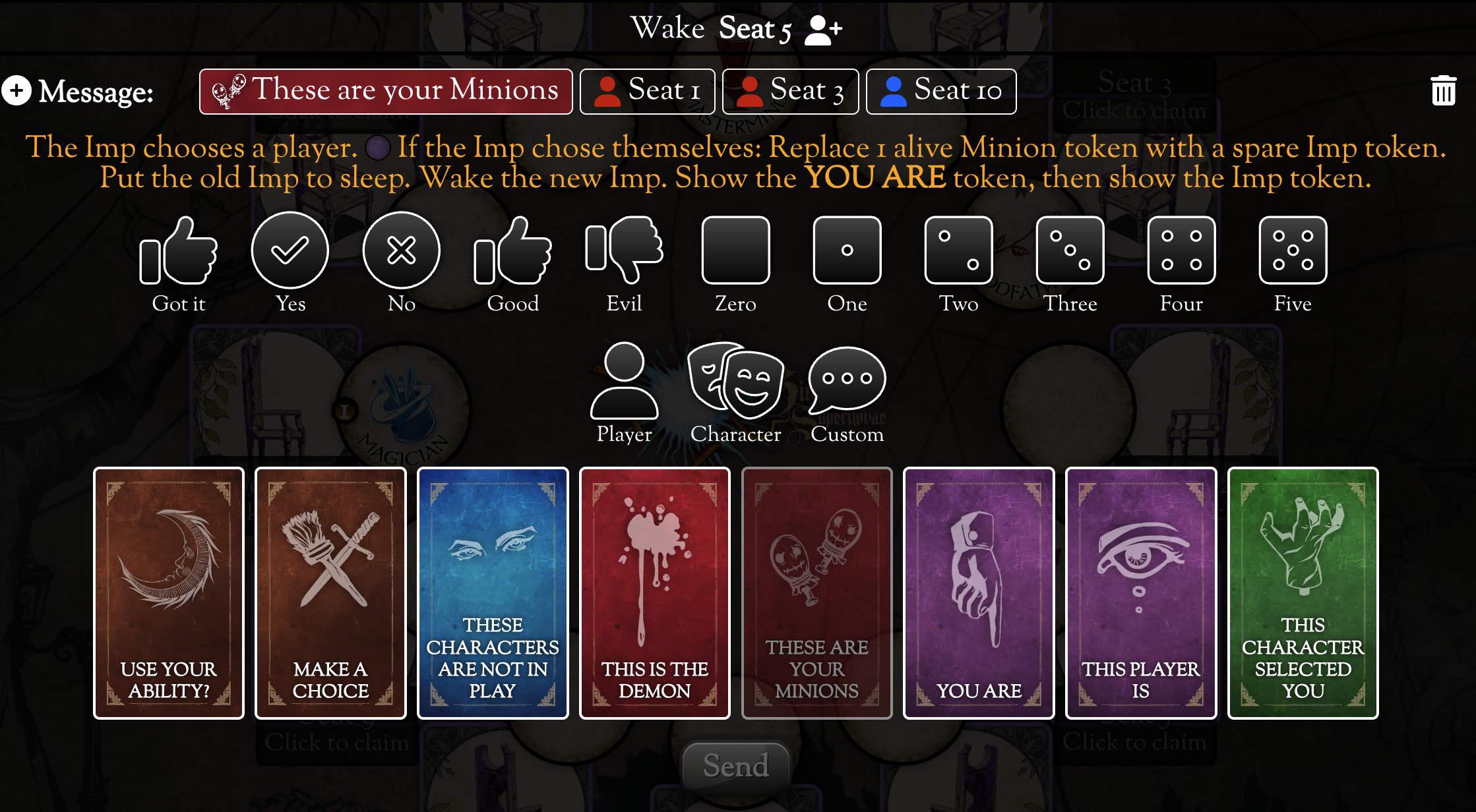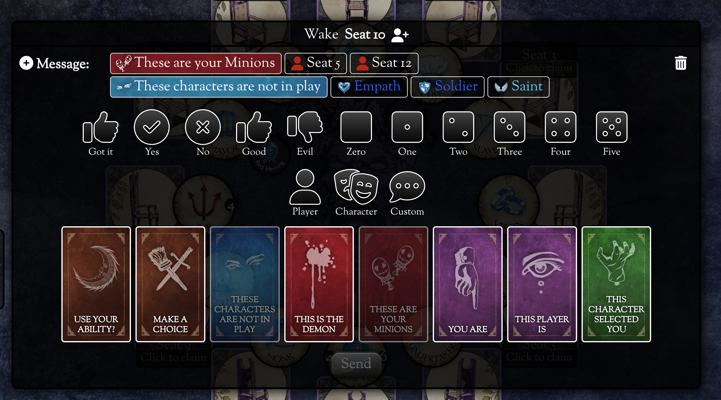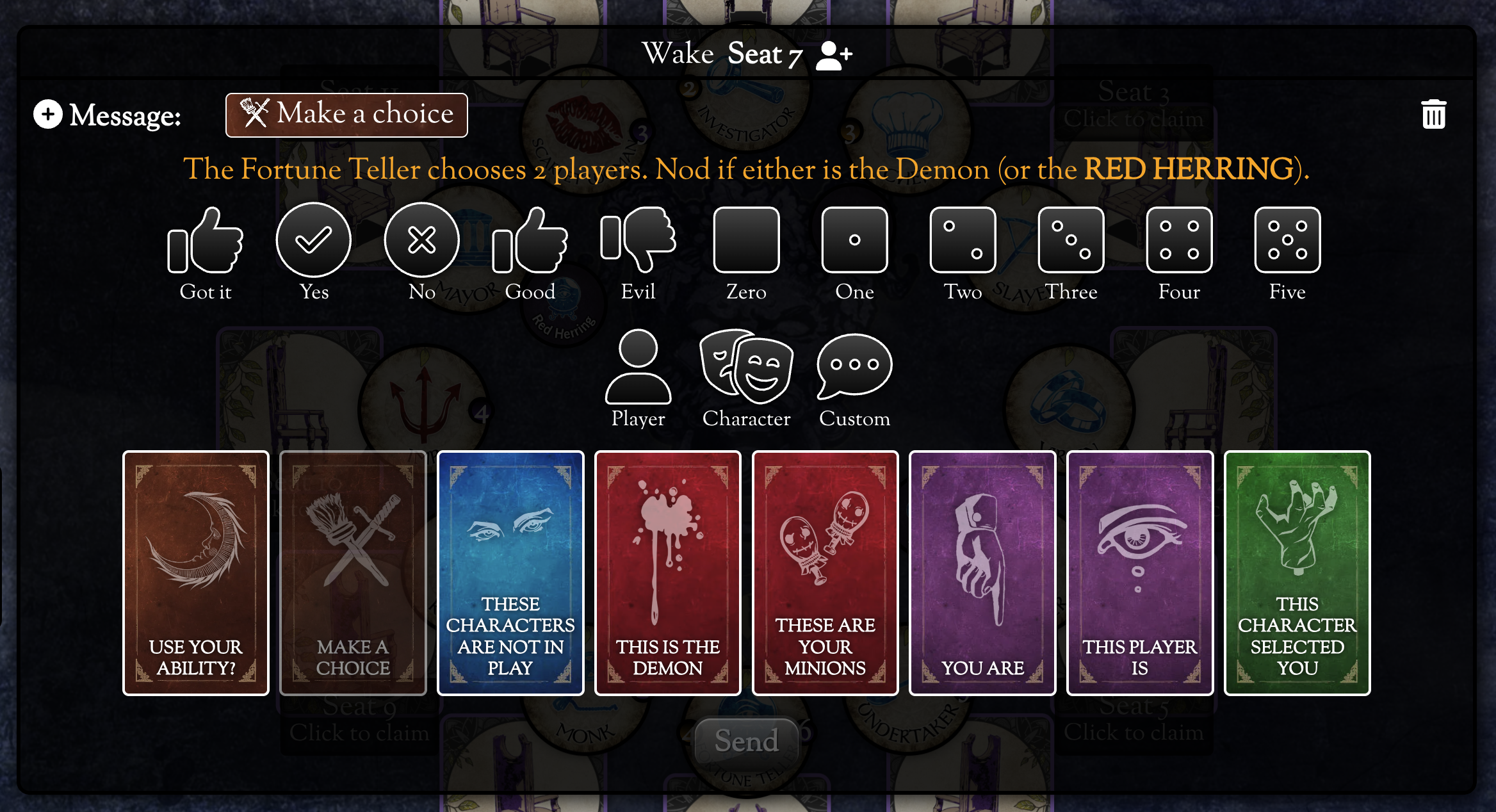 Para despertar a la gente haz un clic en sus fichas y te aparecerán las opciones de cambiar personaje (Change Character), cambiar alineamiento (Change Alignment) y despertar (Wake). Dale a Wake y te aparecerá una pantalla con todas las opciones que tienes. La mayoría son las que tienes en una partida en física, con las tarjetitas abajo, los símbolos arriba y otras opciones en medio. Para mandar la información dale al botón de Send.