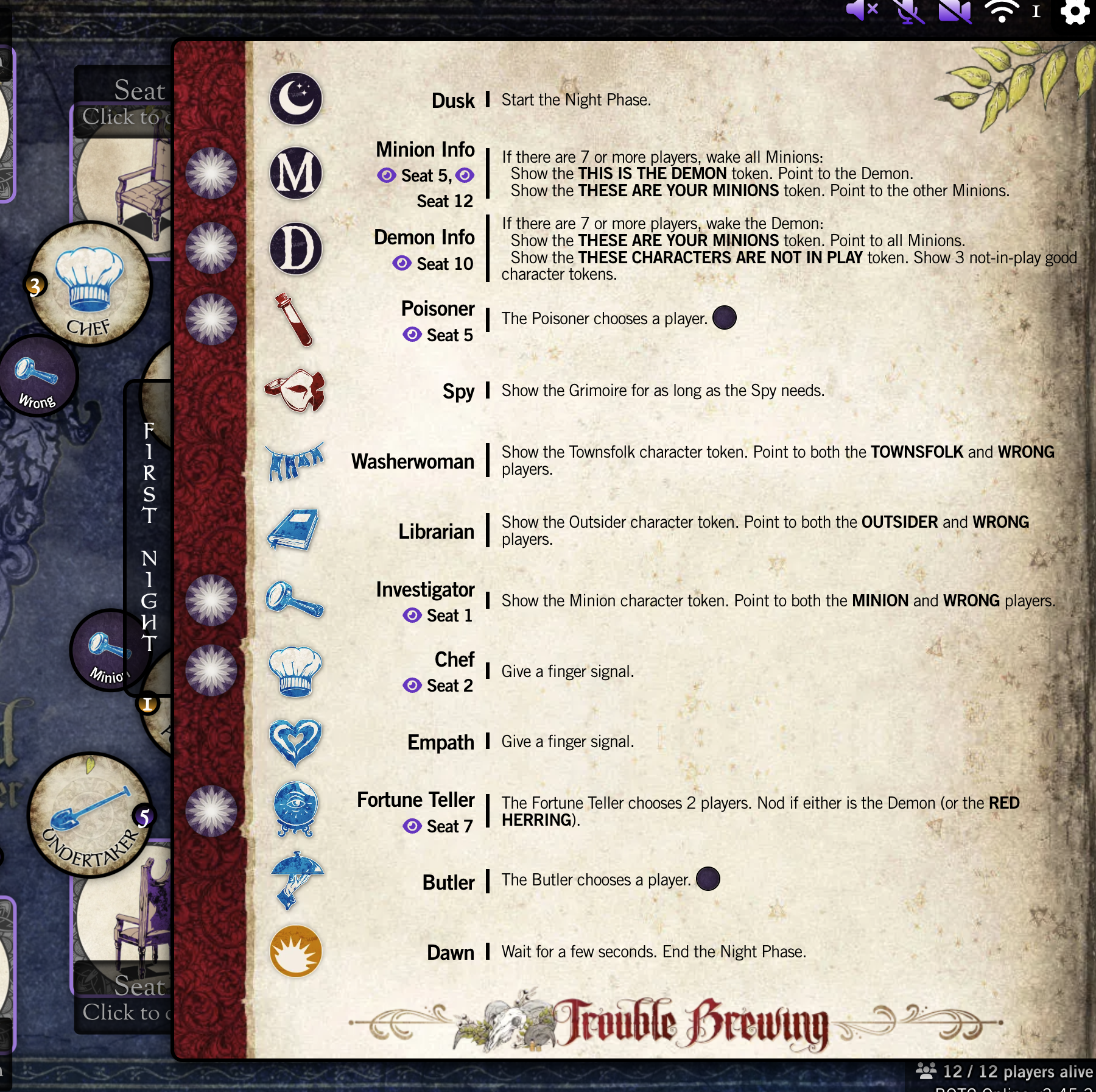 Para seguir el orden en que tienes que despertar a los jugadores, tienes dos opciones. O sigues el número al lado de su ficha (a la izquierda la primera noche, a la derecha las otras. O usas las pestañas de la derecha, con la primera noche y sus instrucciones y otras noches y las suyas.