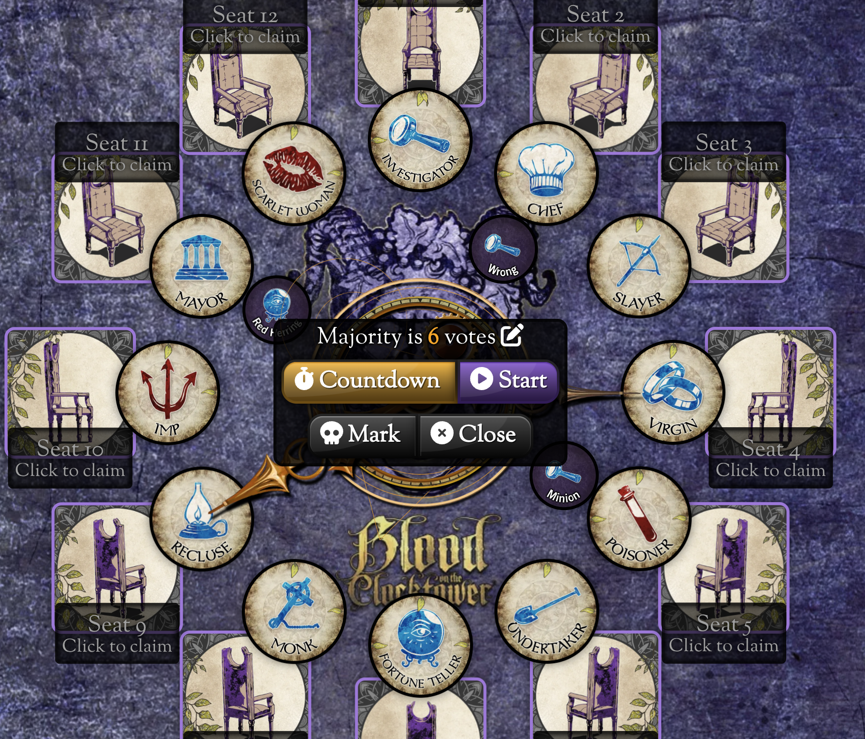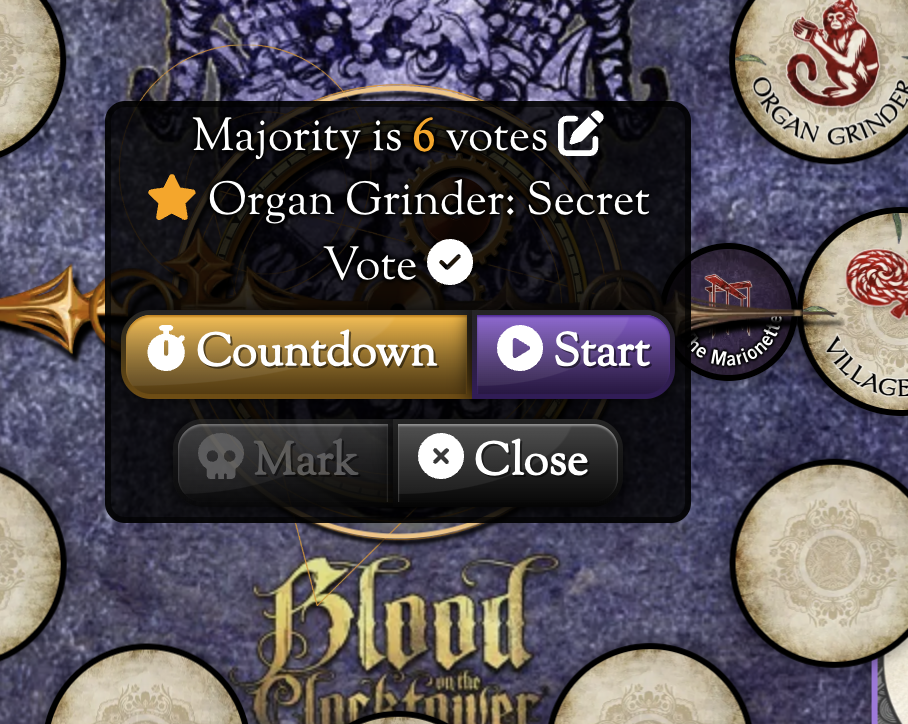 Cuando la aguja pase por cada jugador, contará el voto si tiene la mano levantada. Cuando llegue al final, tendrás el recuento de votos a favor. Entonces, si cumple las condiciones, podrás darle a Mark para añadirle la calavera al jugador nominado. Esto significa que es el jugador con más votos y que, por lo tanto, si acaba el día será ejecutado.