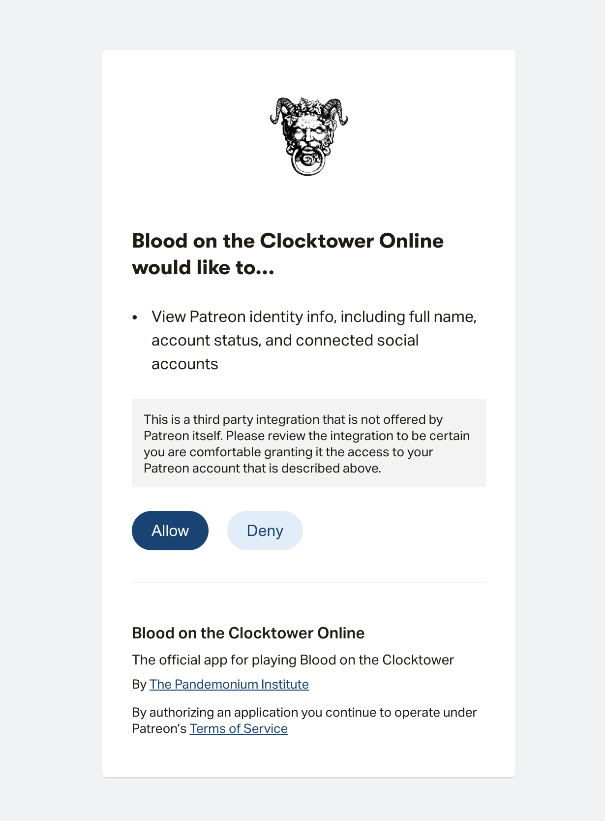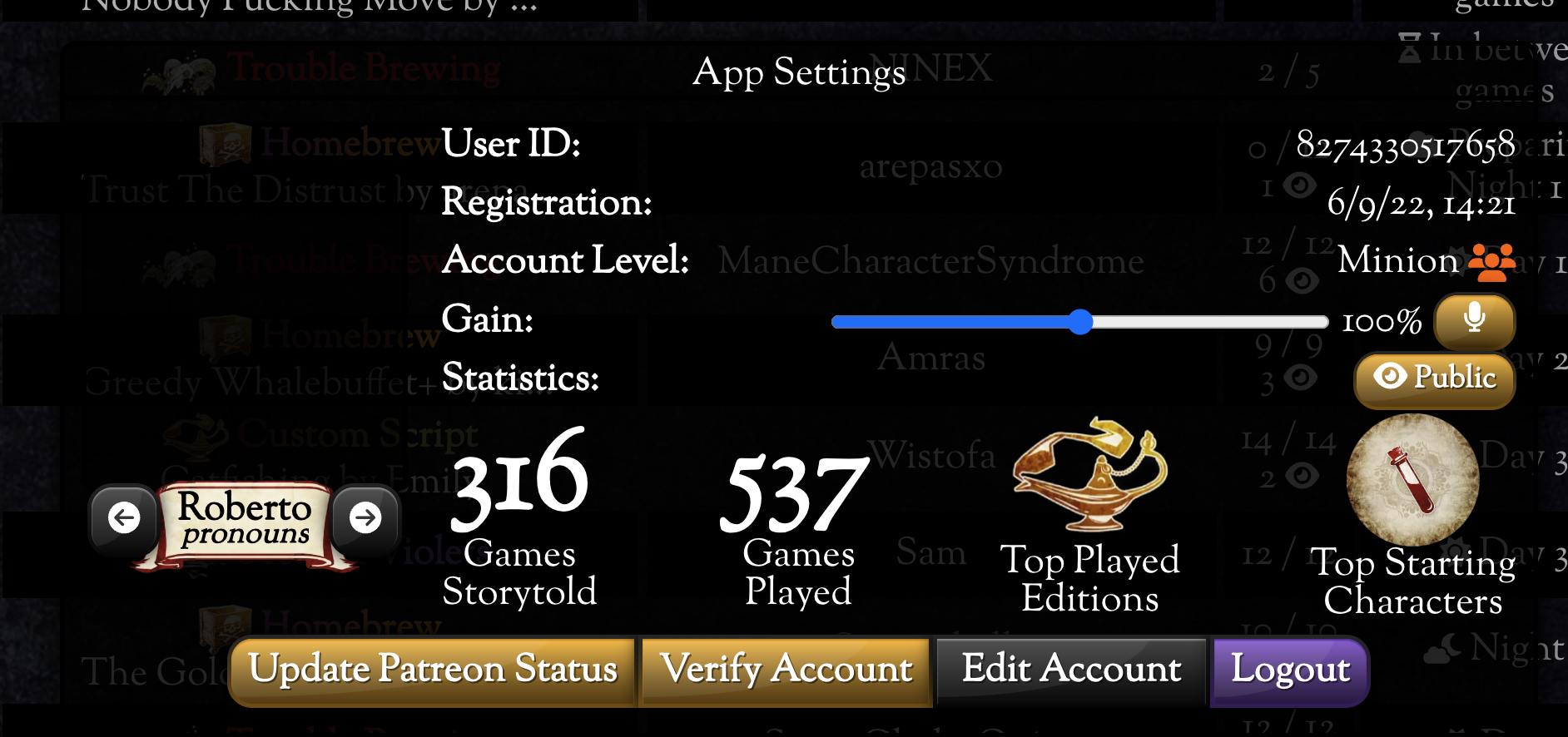 Para poder crear partidas necesitas colaborar con el Patreon del juego. Cualquier nivel te sirve para crear partidas, pero con el nivel Townsfolk todos los jugadores necesitan al menos ese nivel. A partir de Minion, sólo quien crea la partida lo necesita. Una vez tengas tu Patreon, tendrás que asociar tu cuenta de botc.app con la de Patreon.
