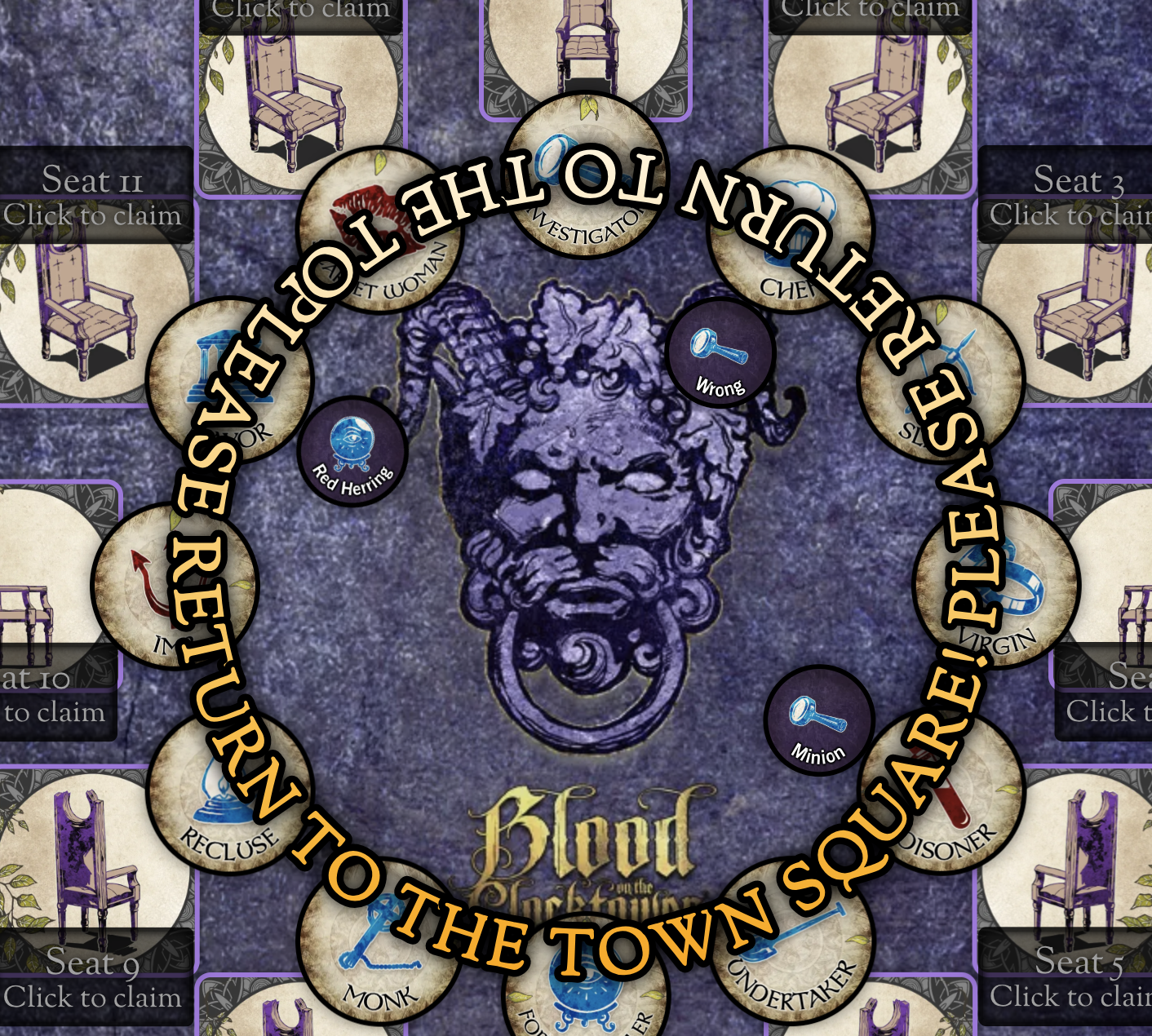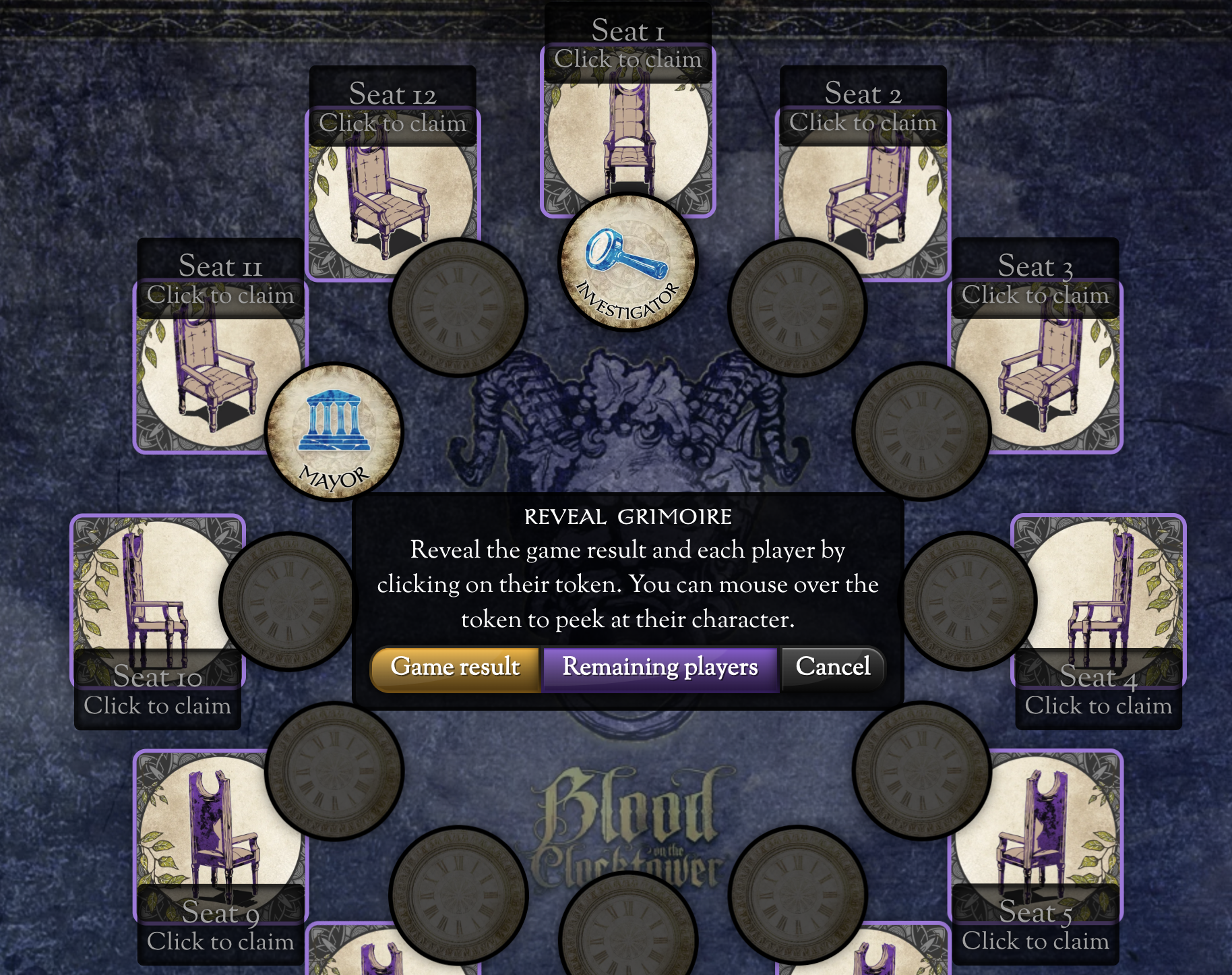 Cuando reveles el Grimorio, puedes hacerlo poco a poco mientras cuentas la historia, con clic en cada ficha para que aparezca a todos los jugadores o un clic en Remaining players para que se revelen todos con unos pocos segundos de margen. También puedes mostrar qué alineamiento ha ganado antes de revelear todos los personajes con Game result.