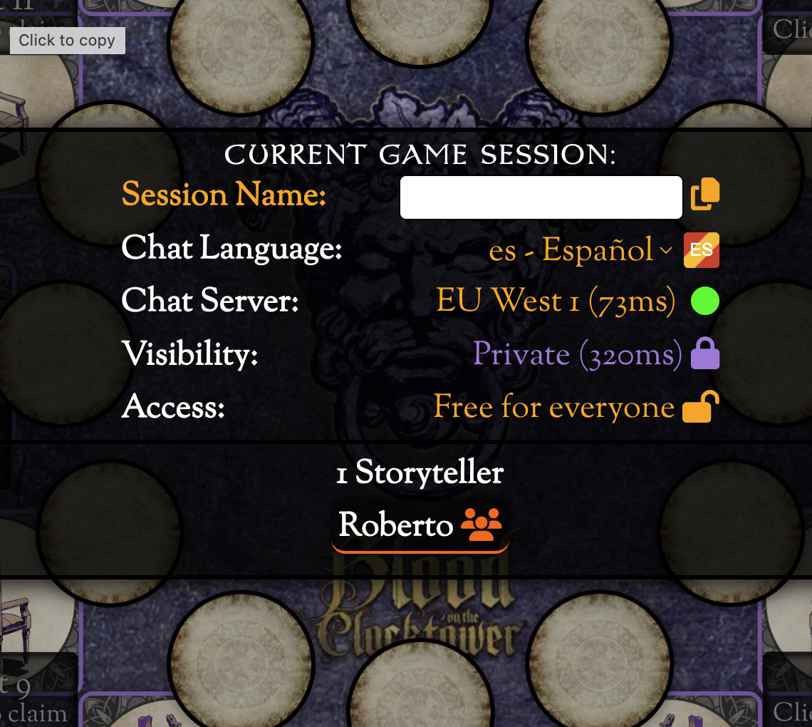 Una vez hecho esto, puedes crear la partida, privada o pública. Si la haces privada, puedes compartir el enlace con el código que aparece en la tercera imagen, en Session Name, a donde puedes llegar con el símbolo de wifi de arriba a la derecha.