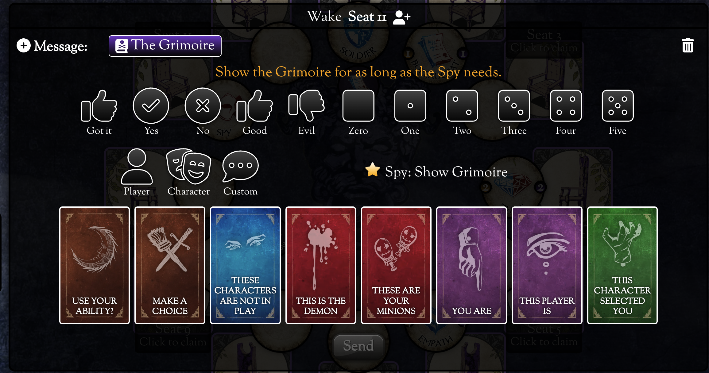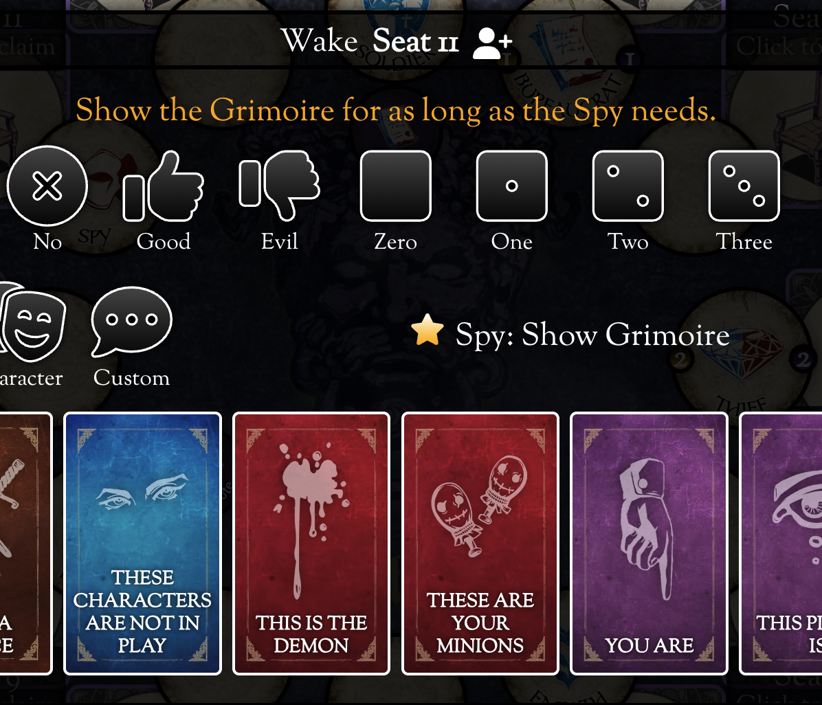 Cuando el Espía o la Viuda pueden ver el Grimorio, despierta con el wake y dale a la opción, exclusiva para estos personajes, de Show Grimoire. Te aparecerá un Grimorio con toda la información pero que podrás modificar antes de enviárselo. Después, dale, como siempre, a Send para enviarle la información real.