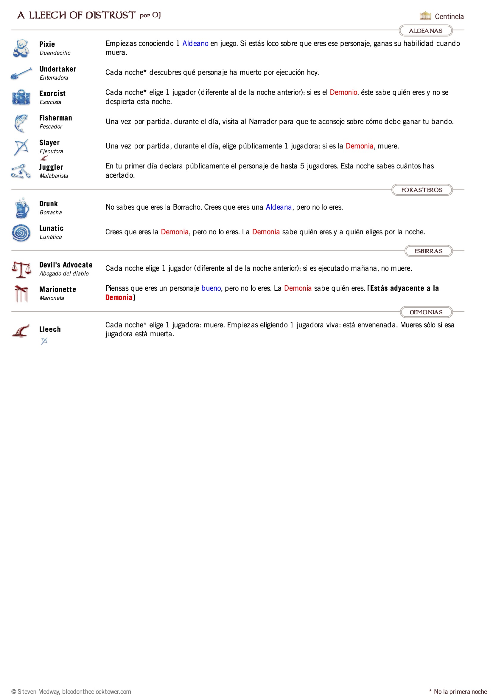 Personajes clave: Lleech, Drunk, Slayer Sólo el Devil's Advocate y el demonio están seguros de su personaje y alineamiento. Estás envenado o eres el Drunk? Eres la Marionette o te están manipulando?