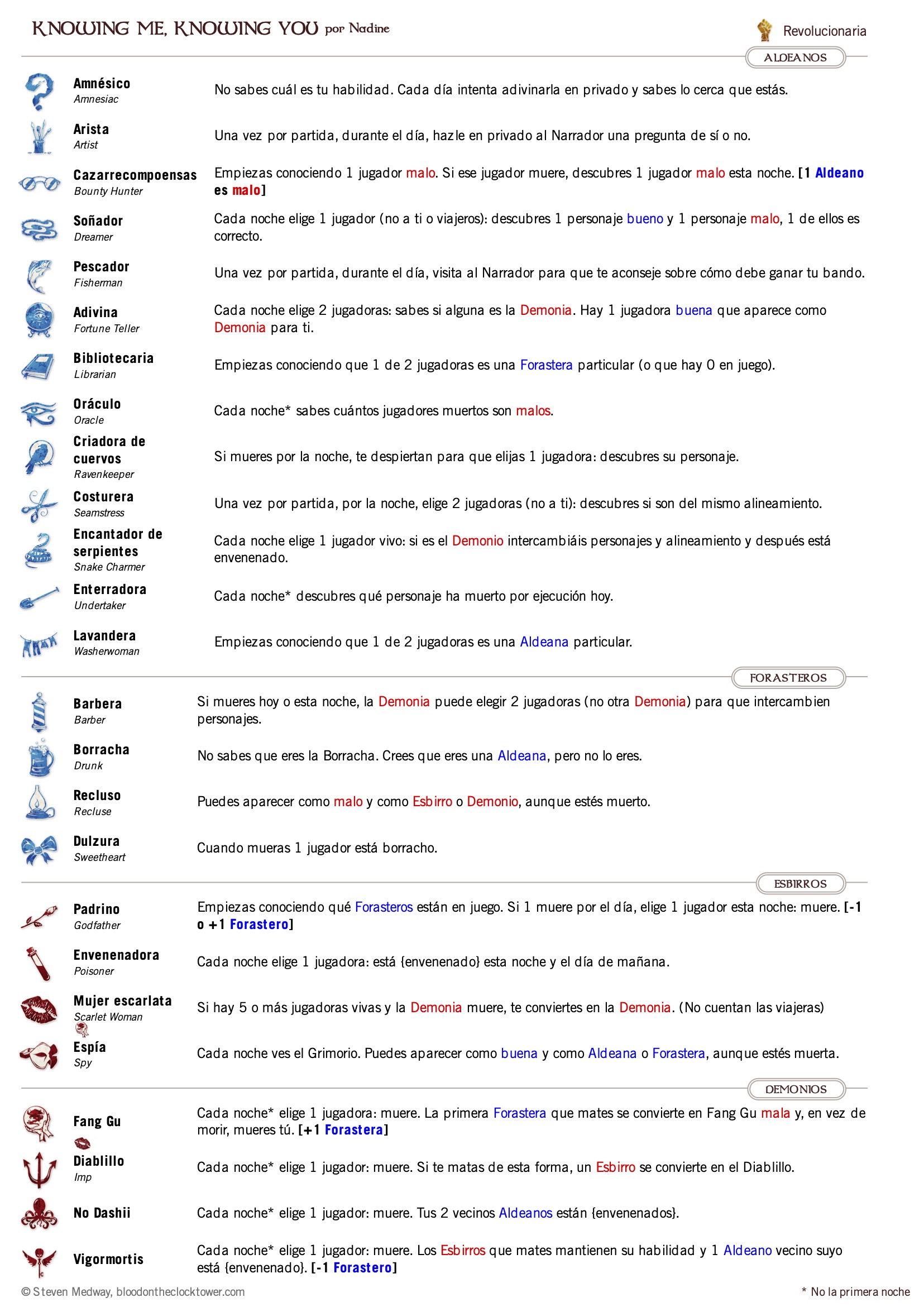 Personajes clave: Recluse, Spy. Revolutionary Este guión está diseñado para jugarse con un número PAR de jugadores, en el que cada jugador forma una pareja revolucionaria con su vecino.