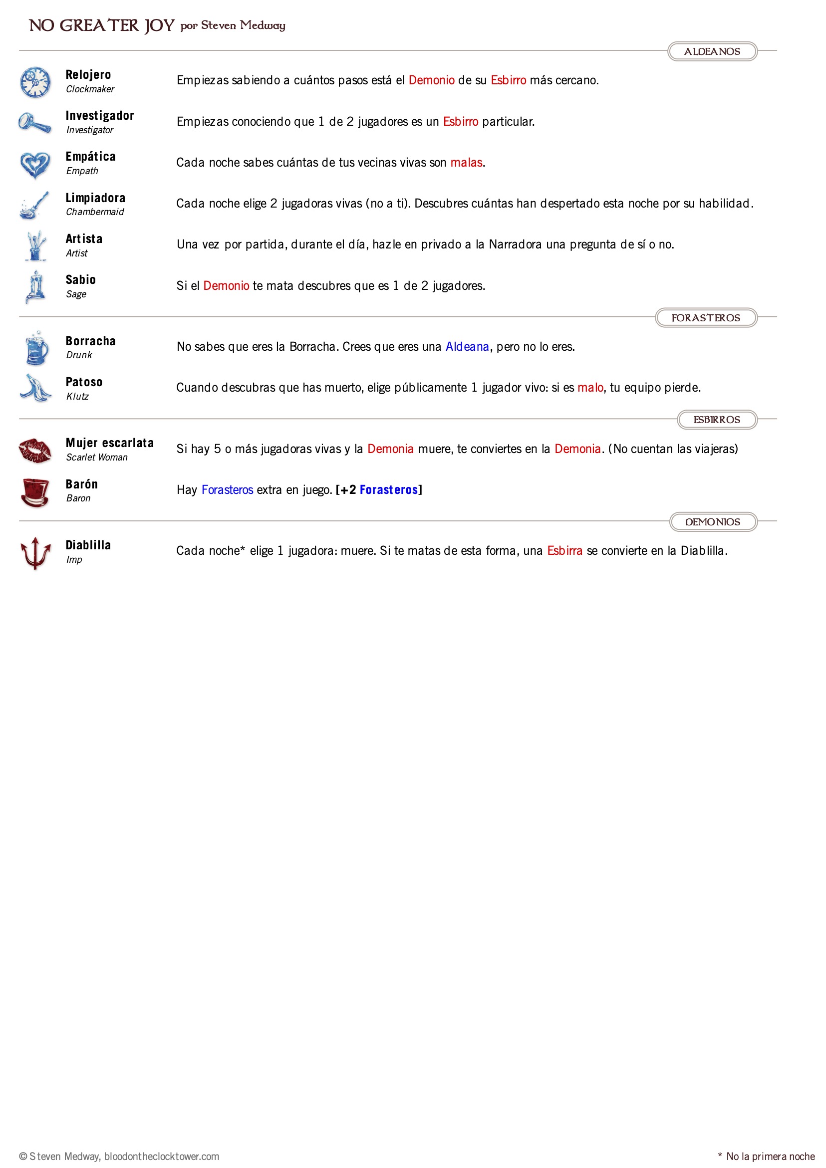 Personajes clave: Clockmaker, Chambermaid, Scarlet Woman. Un paso sencillo para salir de Trouble Brewing y para nuevos/as jugadores/as.