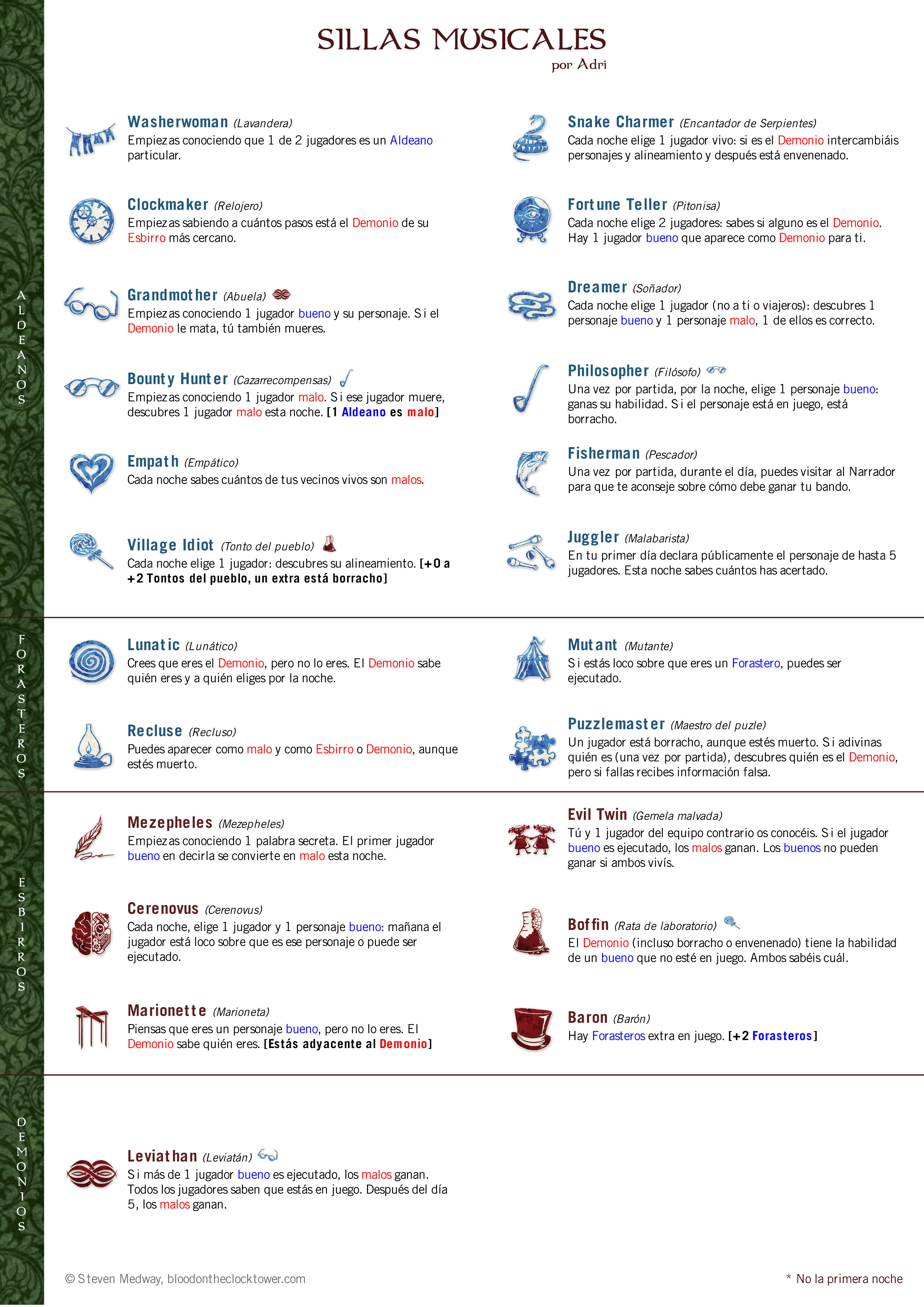 2.5 asientos vacíos por jugador (aprox).[-1 esbirros, +1 aldeano o forastero] Los jugadores empiezan en los primeros asientos y todos empiezan con ficha azul. El narrador puede controlar los esbirros en asientos vacíos. Al comienzo de cada noche, cada jugador, en sentido horario desde el primer asiento, puede elegir cambiar asientos con otro jugador o sentarse en una silla vacía. Se permiten 2 cambios de asiento por jugador. Si un jugador muere o se sienta en un asiento muerto, pierde los cambios que le queden. Cada jugador gana o pierde con el bando al que pertenezca al terminar la partida.Cuando se mueve un jugador, recibe el rol y el alineamiento (marioneta, lunático reciben alineamiento incorrecto) correspondiente al nuevo asiento. Los roles de primera noche se activan únicamente la primera noche que tengan un jugador sentado