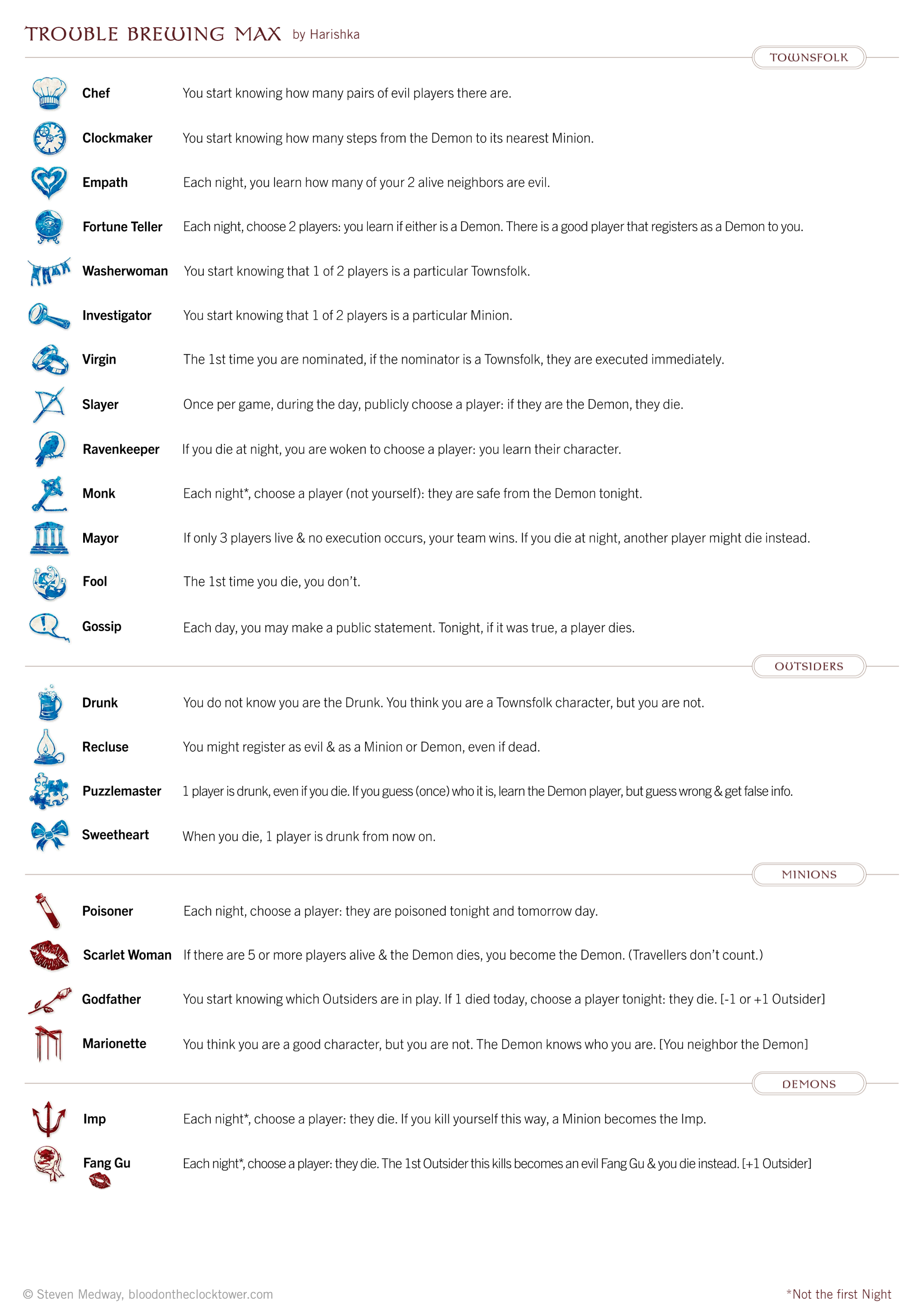 Un guión inspirado en Trouble Brewing, pero con algunos pequeños cambios de roles (un par de esbirros, un par de forasteros y tres aldeanos) al que se le añade también un segundo demonio. Está pensado para ir un paso más allá de Trouble brewing, que aquellas personas que llevan pocas partidas a BOTC puedan ir conociendo, poco a poco, algunos roles nuevos desde la seguridad que ofrece pisar un terreno familiar y poder reconocer a la mayoría de los otros roles.